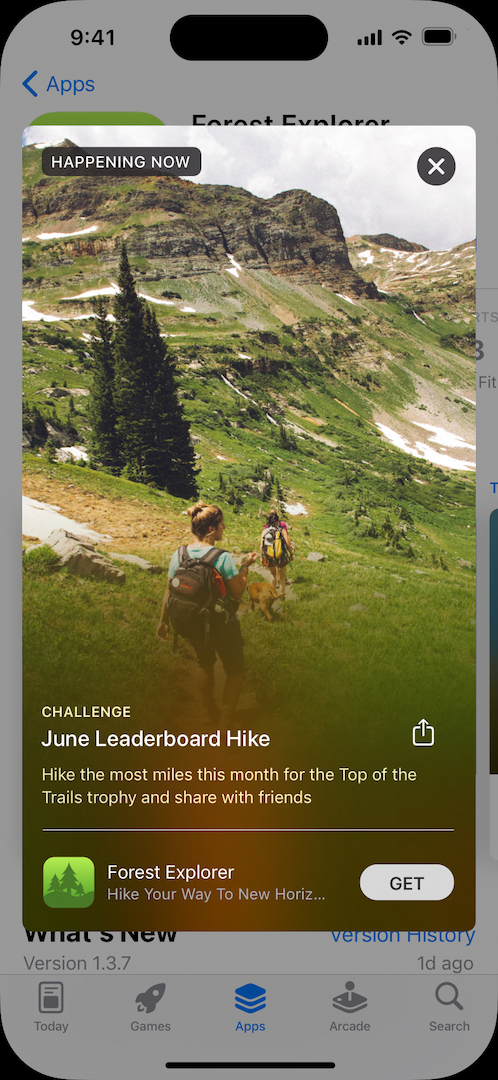 App 内活动会以活动卡片的形式在 App Store 上展示,卡片将包括图像或视频、活动名称和简要描述 (在 iOS 15、iPadOS 15,及更高版本中)。对于需要 App 内购买项目或订阅才能参与的活动,用户可以轻点打开活动详情页面,此页面会显示更详尽的活动描述和说明,让顾客能更沉浸且期待你的活动。顾客可以在此页面上,通过“信息”或社交媒体等方式分享你的活动。他们还可以在活动卡片和活动详情页面上选择加入,这样在你的活动开始时,App Store 便会向他们发送通知。