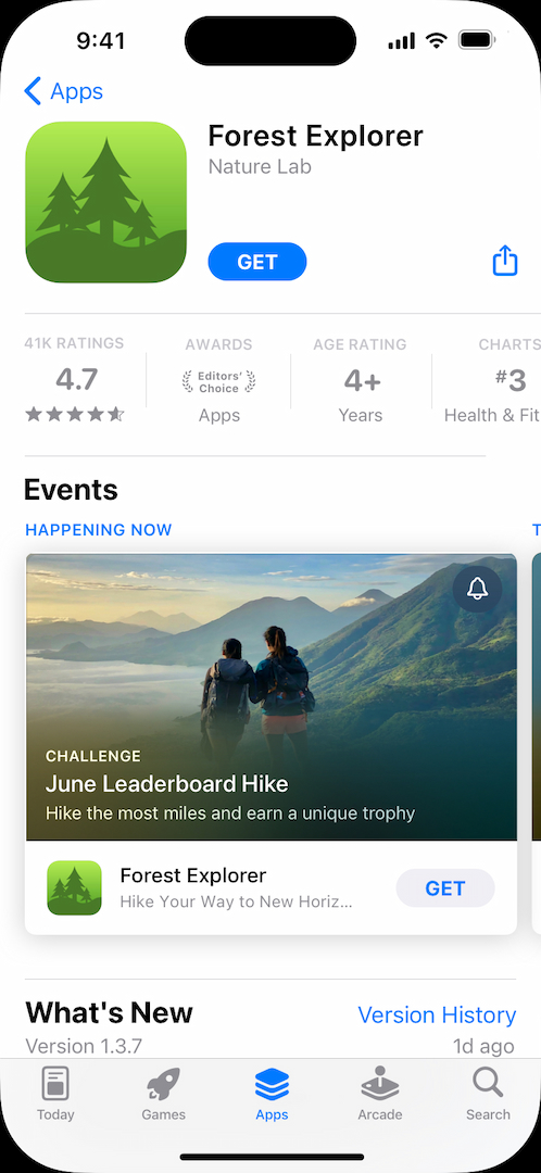 活动卡片和活动详情的媒体素材:添加图像或视频,在 App Store 上更直观地展示你的 App 内活动。视频会自动反复播放,力求打造一个无缝循环。在 App Store Connect 中,你可以预览你提供的媒体素材在活动卡片和活动详情页面上的显示情况,以确认图像或视频中的重要部分不会被遮挡。