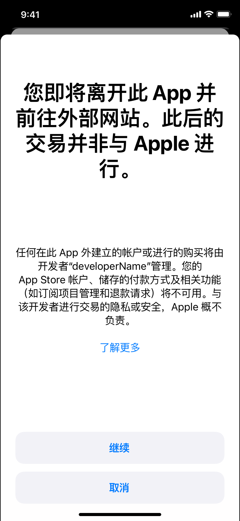 遵循模态表单详细信息。在 iOS 16 和/或 iPadOS 16 或更高版本,以及 Apple tvOS 16.4 或更高版本中,你可以使用 External Link Account API 来实现相关功能。对于运行 iOS 和 iPadOS 较早版本的设备,你需要完全按照下方提供的模态表单设计和文本来实现模态表单。