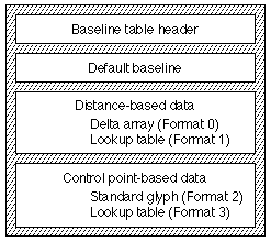 A baseline table consists of a baseline table header, a default baseline, and either a distance-based array (Formats 0 or 1) or a control point-based array (Formats 2 or 3) containing the format-specific baseline data. The font developer must choose between using distance-based data or control point-based data. Only one of these is present in any one font. The overall structure of the baseline table is shown here: