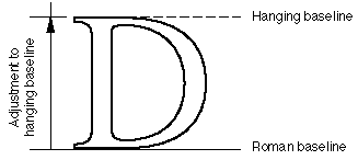The next figure shows that a second baseline, marked as a hanging baseline, has been added to the first. The roman baseline is the same as the font's natural baseline, so the delta between the two is zero. The hanging baseline is above the natural baseline by some distance. In this font's coordinate system, "up" is towards more positive coordinates, so the shift is a positive value.