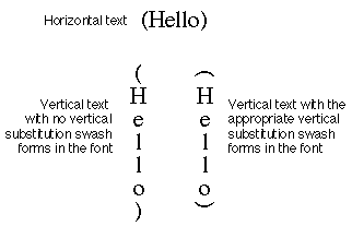 Let's create a Roman font that accommodates horizontal and vertical text. We will specifically address the problem that occurs when horizontal text with opening and closing parentheses is used vertically. When the text is horizontal, our font should use the horizontal opening and closing parentheses (glyph indices 11 and 12, respectively). When the text is vertical, our font should use the vertical opening and closing parentheses (glyph indices 135 and 136, respectively).