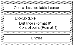 The overall structure of the optical bounds table consists of an optical bounds table header, a lookup table, and the actual optical bounds entries, as shown in the following figure:
