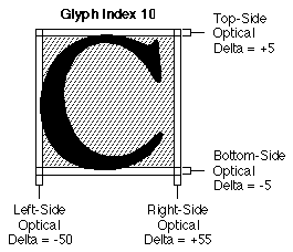 Let's look at a roman font that provides optical edge data for rounded letters. There is optical bounds data for two glyphs, uppercase 'C' (glyph index 10 for this font) and uppercase 'A' (glyph index 43). There is a top-side amount for the uppercase 'A' glyph, since this font should look nice for vertical text as well as horizontal text. The following figure shows the optical bounds for glyph index 10.