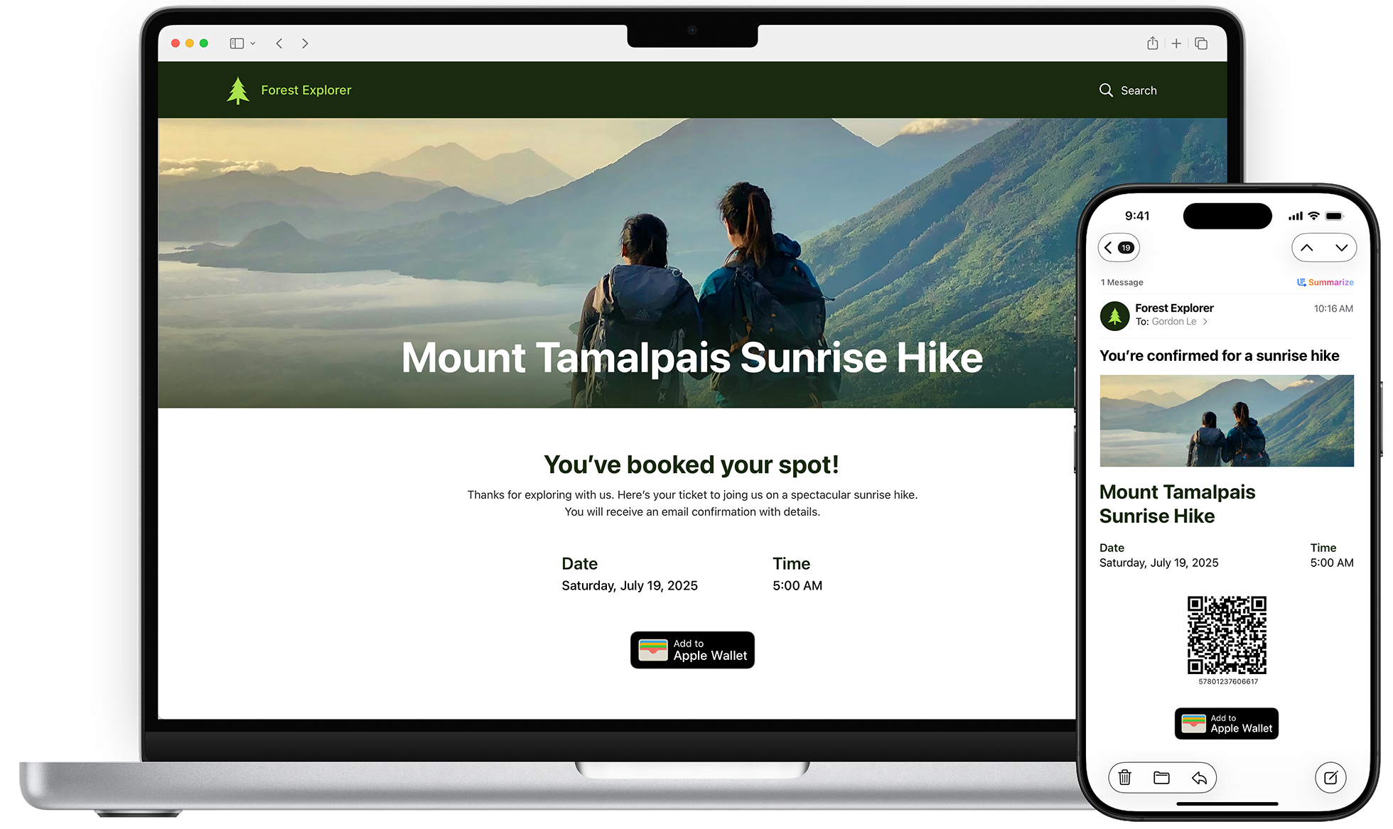 ウォレット対応のパスを宣伝するコミュニケーションでは、ウォレットについて説明するメッセージを記すことができます。そうしたメッセージは、パスで使用する「Appleウォレットに追加」のバッジの近くに配置したり、製品とウォレットとの互換性を説明する一般的なコミュニケーションの中で使用したりすることができます。