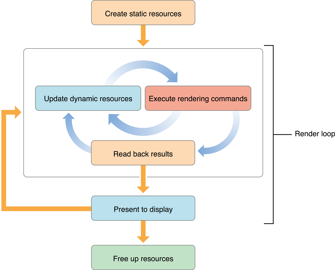 The rendering loop processes all of the items you intend to render to the OpenGL ES context, then presents the results to the display. In an animated scene, some data is updated for every frame. In the inner rendering loop shown in Figure 6-6, the app alternates between updating rendering resources (creating or modifying OpenGL ES objects in the process) and submitting drawing commands that use those resources. The goal of this inner loop is to balance the workload so that the CPU and GPU are working in parallel, preventing the app and OpenGL ES from accessing the same resources simultaneously. On iOS, modifying an OpenGL ES object can be expensive when the modification is not performed at the start or the end of a frame.