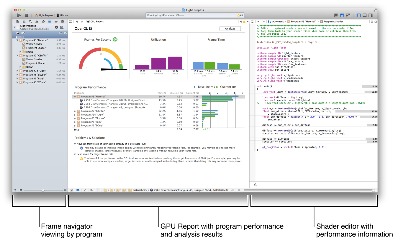 Problems & Solutions. Only appears after Xcode analyzes a frame capture (see Capturing and Analyzing an OpenGL ES Frame), this area lists possible issues found during analysis and recommendations for improving performance.