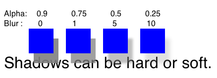 If you set the shadowColor property to an RGBa color with an alpha value less than 1, the shadow is partly transparent, allowing you to see the background, which is darkened by the shadow but not completely obscured. Greater transparency lightens the shadow and mimics softer lighting.