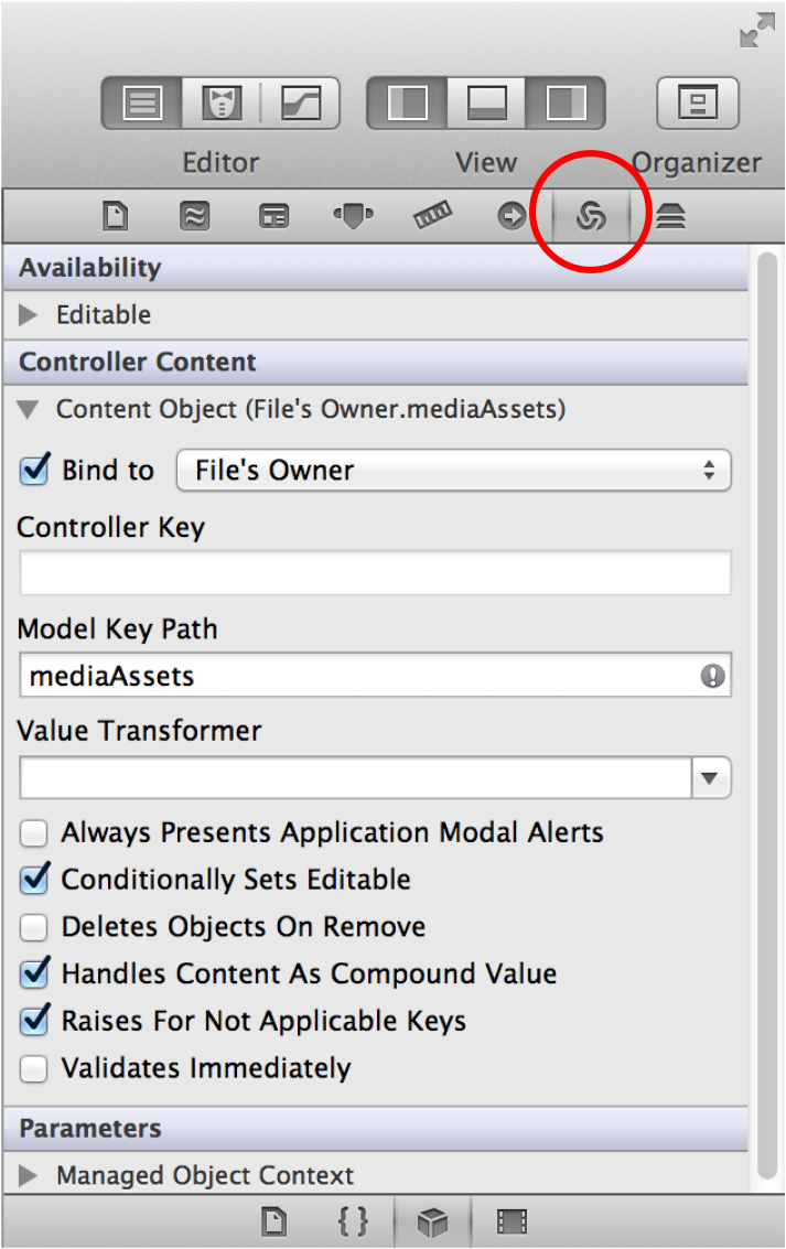 Bind toaspect to the object that maintains the collection of model objects (for example, the File’s Owner).Leave the