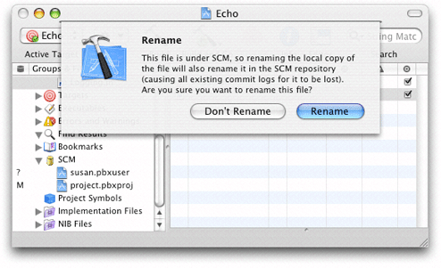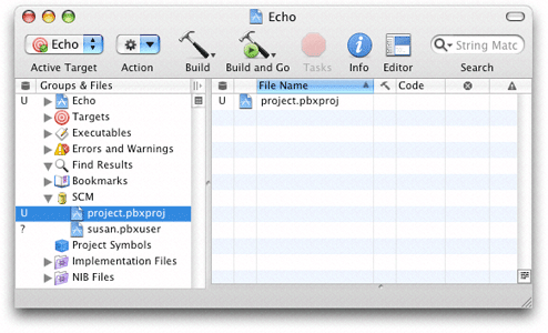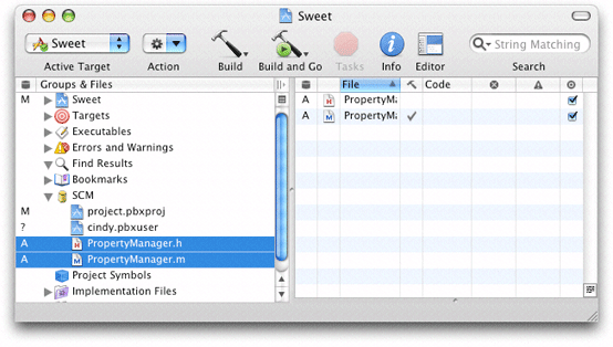 After you add a file to your local copy of a managed Xcode project, its status is ? (unknown). This means that the file is not part of the repository. If you want to add the file to the repository the next time you commit your changes, select the file in the project window or the SCM Results window and choose SCM > Add to Repository. The status of the file changes from ? to A. Figure 22-4 shows files in the SCM group to be added to the repository in the next commit.