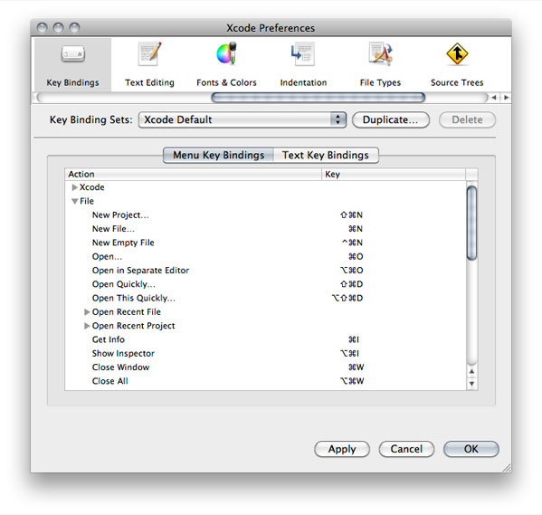 Xcode lets you change the keyboard shortcuts for actions accessible through menu items or the keyboard, such as paging through a document or moving the cursor. You can choose a predefined set of keyboard shortcuts for menu items and other tasks, or you can create your own set. The predefined sets include sets that mimic BBEdit, Metrowerks, CodeWarrior, and MPW.