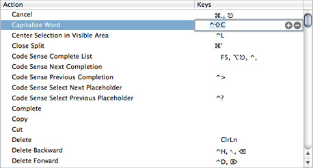 4. Double-click in the Keys column in the Capitalize Word row to open an editing field, then press Shift-Control-C (holding the keys down simultaneously). The result is shown in Figure 7-4.