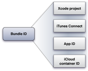 During the development process, you use an app’s bundle ID in many different places to identify the app. Figure 3-2 shows the most common places where an app’s bundle ID is used during the development process.