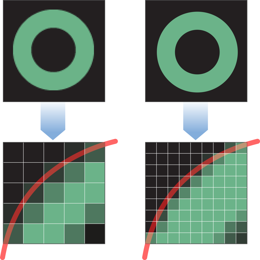 When you run a high-resolution-savvy app on a high-resolution device, the text, vector drawing, and UI controls are sharp. This is due to the increased pixel density—pixels are smaller and there are more of them per unit area. Each point in user space is backed by four pixels. The increase in pixel density results in higher details for drawing and text rendering. As shown in Figure I-1, a standard-resolution display has fewer pixels available to approximate the shape of a curve, resulting in a jagged look when magnified. But a high-resolution display has quadruple the pixels available to approximate the curve, resulting in a much smoother-looking curve. Magnified or not, when you look at the same shape on a standard-resolution display and a high-resolution one, the difference is obvious immediately.