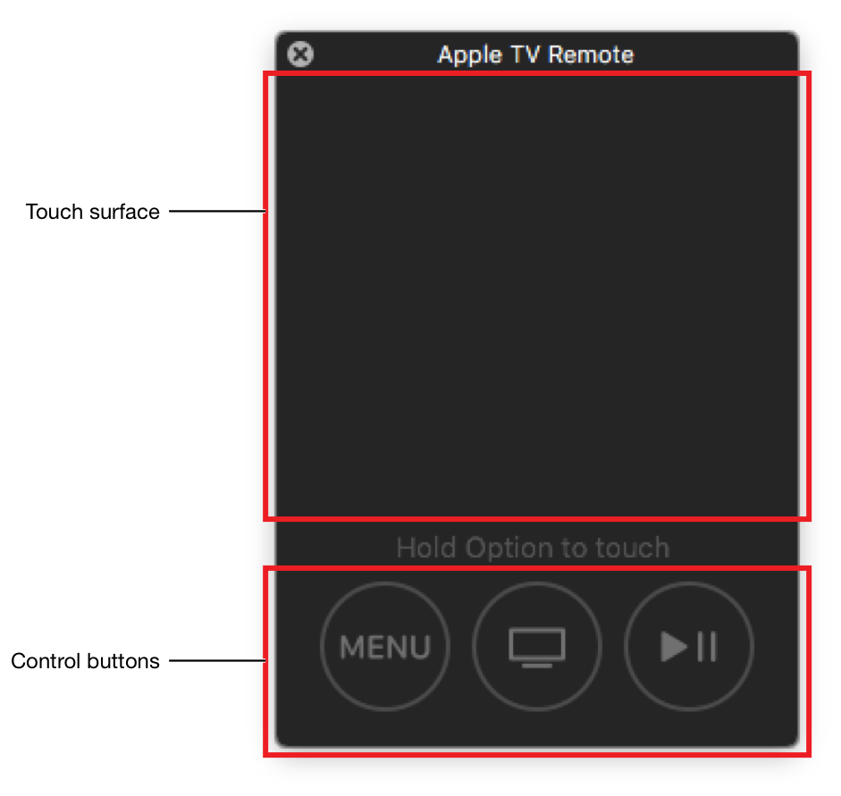 The simulated remote has two main areas—a touch surface, used for navigation and selection, and a bottom area containing control buttons to trigger actions.