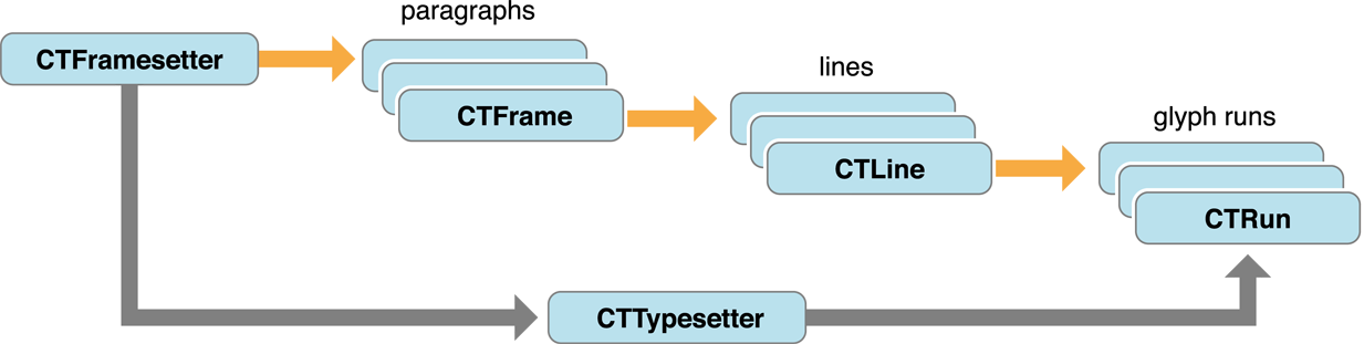 Core Text objects at runtime form a hierarchy that is reflective of the level of the text being processed (see Figure 9-1). At the top of this hierarchy is the framesetter object (CTFramesetterRef). With an attributed string and a graphics path as input, a framesetter generates one or more frames of text (CTFrameRef). As the text is laid out in a frame, the framesetter applies paragraph styles to it, including such attributes as alignment, tab stops, line spacing, indentation, and line-breaking mode.
