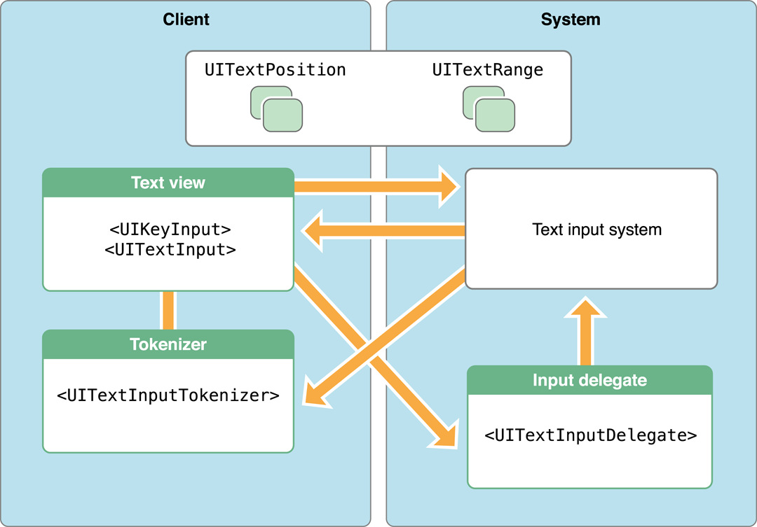 The text input system calls the UITextInput methods that the text view implements. Many of these methods request information about specific text positions and text ranges from the text view and pass the same information back to the class in other method calls. The reasons for these exchanges of text positions and text ranges are summarized in Tasks of a UITextInput Object.