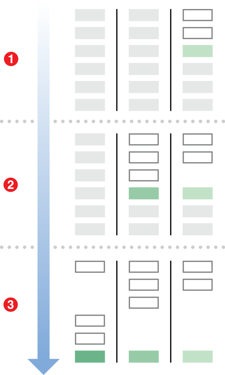 In step 1, the cells of the last column have been placed in sequential order. In step 2, the layout is determining the frames for the second column. In this column, the cells can be laid out sequentially since no cell has more than one child. However, the green cell’s frame must be adjusted to match that of its parent cell, so it is shifted down one space. In the final step, the cells for the first column are being placed. The first three cells of the second column are the children of the first cell in the first column, so the cell’s following the first cell in the first column are shifted down. In this case, it is not actually necessary to do so since the two cell’s following the first have no children of their own, but the layout object is not smart enough to know this. Rather, it always adjusts the space in case any cell following one with children has children of its own. As well, the green cells have now both shifted down to match that of their parent.