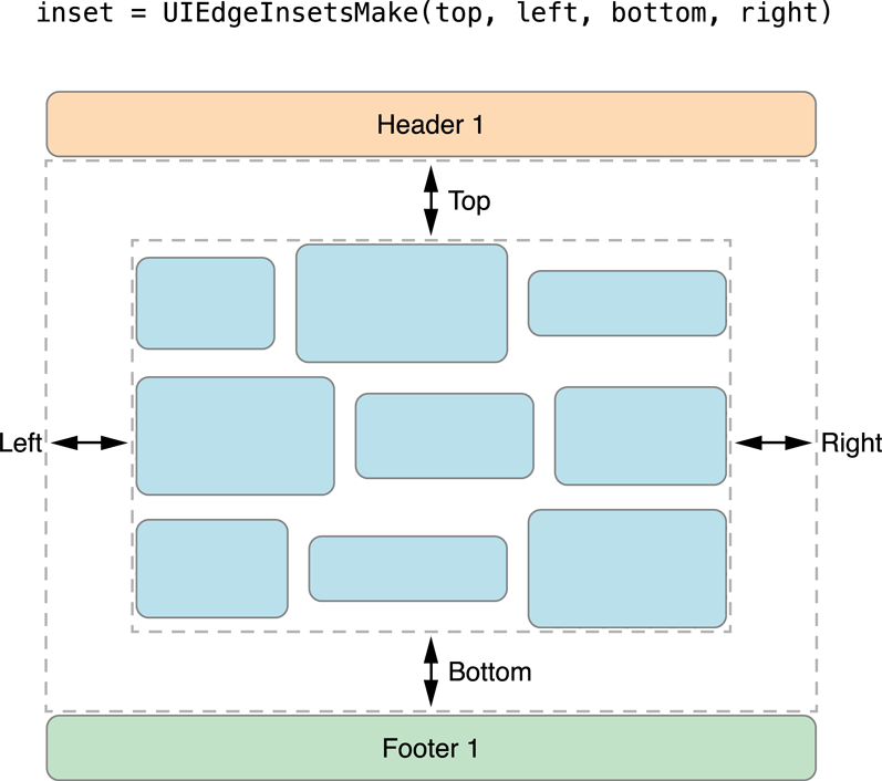 Section insets are a way to adjust the space available for laying out cells. You can use insets to insert space after a section’s header view and before its footer view. You can also use insets to insert space around the sides of the content. Figure 3-5 demonstrates how insets affect some content in a vertically scrolling flow layout.