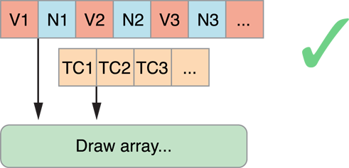 You can specify vertex data as a series of arrays (also known as a struct of arrays) or as an array where each element includes multiple attributes (an array of structs). The preferred format on iOS is an array of structs with a single interleaved vertex format. Interleaved data provides better memory locality for each vertex.