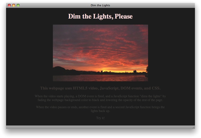 The example listens for the playing, pause, and ended events. When the playing event fires, a function stores the current background color, sets the background color to black, and sets the opacity of the rest of the page to 0.25. When the pause or ended event fires, a second function restores the background color and sets the opacity to 1.