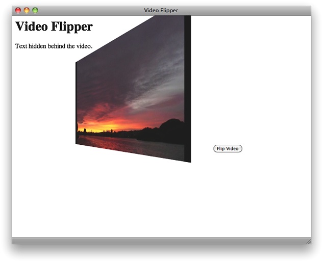 Listing 5-3 dynamically flips a playing video 180° around its y axis, intermittently revealing the text behind the video. The video has perspective when it rotates, due to the -webkit-perspective property of the body element.