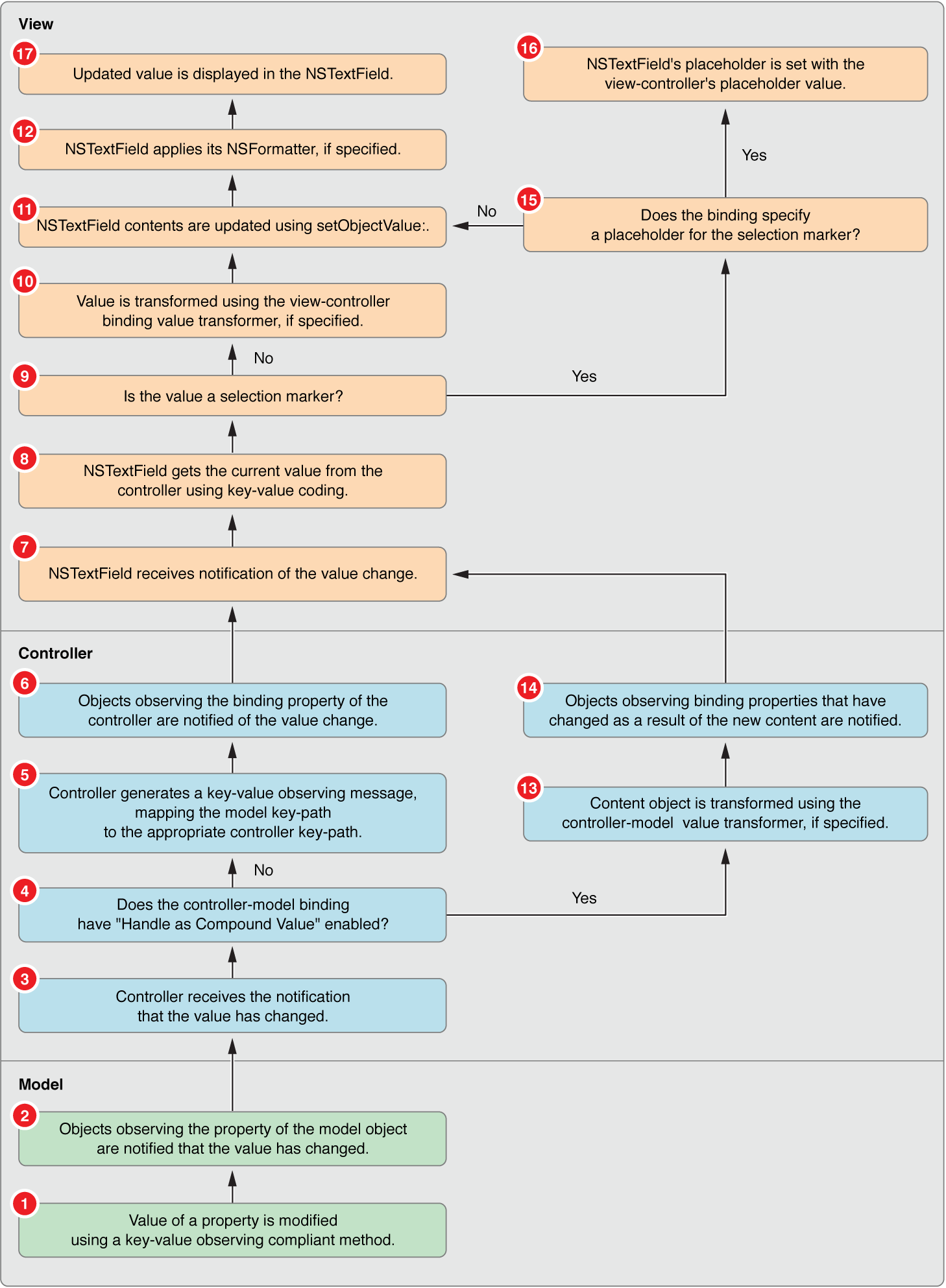 A binding has a number of possible options that can be configured, and many of these will influence the flow of messages between the controller, view and model objects. Value transformers, NSFormatters, key-value validation, placeholders, selection value markers, and other binding options, all affect changes made in the user interface, and in the model values. This article describes the flow of messages between the objects for common interactions with the view, controller, and model objects.