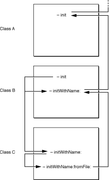 Figure 2-4 shows how all the initialization methods in classes A, B, and C are linked. Messages to self are shown on the left and messages to super are shown on the right.