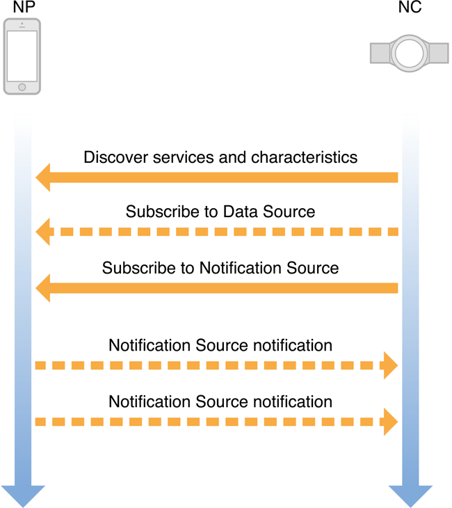 GATT notifications may be delivered as soon as the NC subscribes to the Notification Source characteristic. As a result, the NC should be in a state where it can properly accept and process these messages before subscribing to this characteristic.