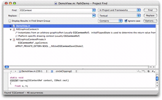 When you perform a project-wide find, the results of the search are collected in the find results pane of the Project Find window; results are organized according to the file in which they appear, as shown in the figure below. You can view a particular search result by selecting it in the Project Find window; Xcode opens the file to the matching text and displays it in the attached editor. Double-click a search result to open it in a separate editor window.