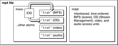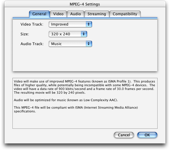 .mp4file or a QuickTime.movfile using MPEG-4 compression. This allows you to mix MPEG-4 audio and video with other QuickTime media, such as VR panoramas, sprites, or Flash tracks. Discussed in the section MPEG-4 and Web Developers.A new group of MPEG-4 settings dialogs in QuickTime Player that enable QuickTime Pro users who work with MP4 files to make a number of adjustments in video and audio tracks, streaming and compatibility. Discussed in the section Working with MPEG-4 Files.