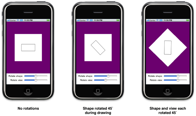 Figure 1-6 demonstrates how two different rotation factors combine visually when rendered. Inside the view’s drawRect: method, applying a 45 degree rotation factor to a shape causes that shape to appear rotated by 45 degrees. Applying a separate 45 degree rotation factor to the view then causes the shape to appear to be rotated by 90 degrees. The shape is still rotated by only 45 degrees relative to the view that drew it, but the view rotation makes it appear to be rotated by more.