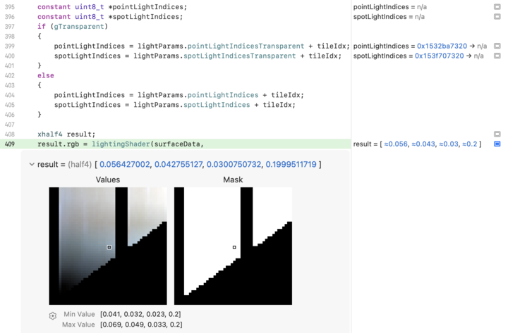 The shader debugger helps you debug issues in your shader code by jumping to any point and inspecting variable values during shader execution. Edit the shader code and reload your changes to verify the fix.