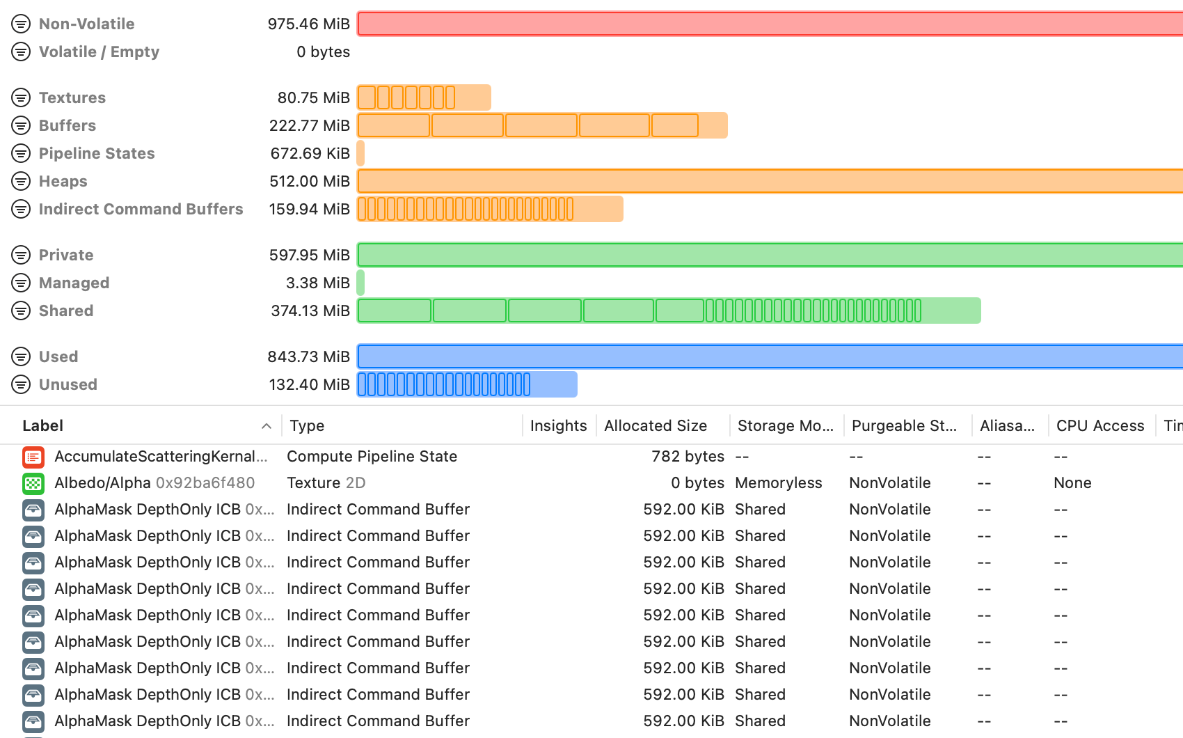 The Metal debugger includes a comprehensive report of your Metal memory usage to help you optimize and reduce the memory footprint of your Metal app.
