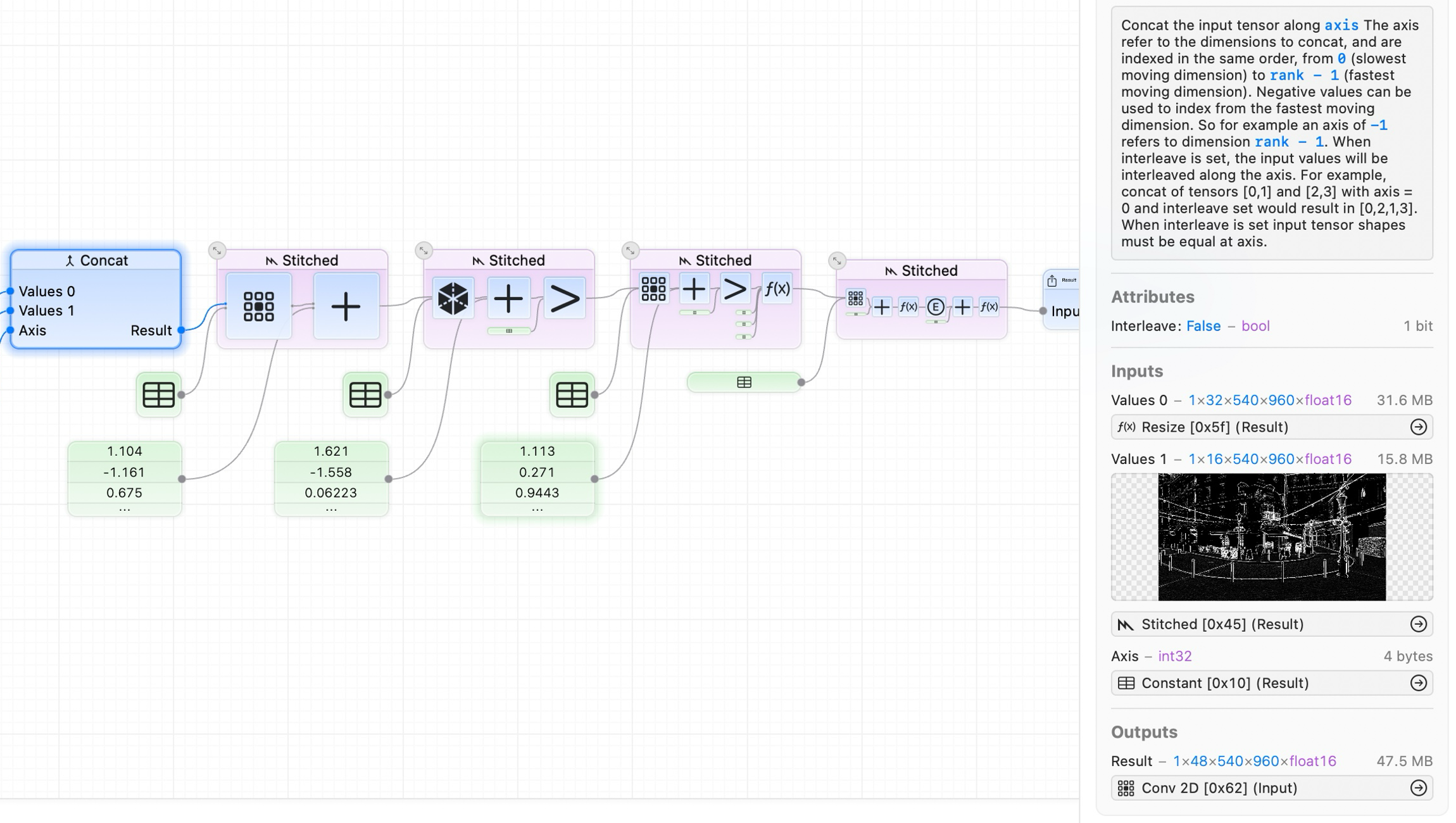 The machine learning network debugger can evaluate operations at any point in your machine learning network, helping you to debug unexpected intermediate values in input or outputs from any operation executed on the GPU.