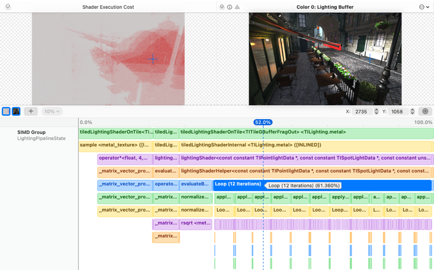 Performance heat maps in Xcode make it easy to discover expensive pixels or compute threads by visualizing a comprehensive set of performance metrics. You can then select a SIMD group to view its entire execution history, including function calls, loop iterations and active threads.