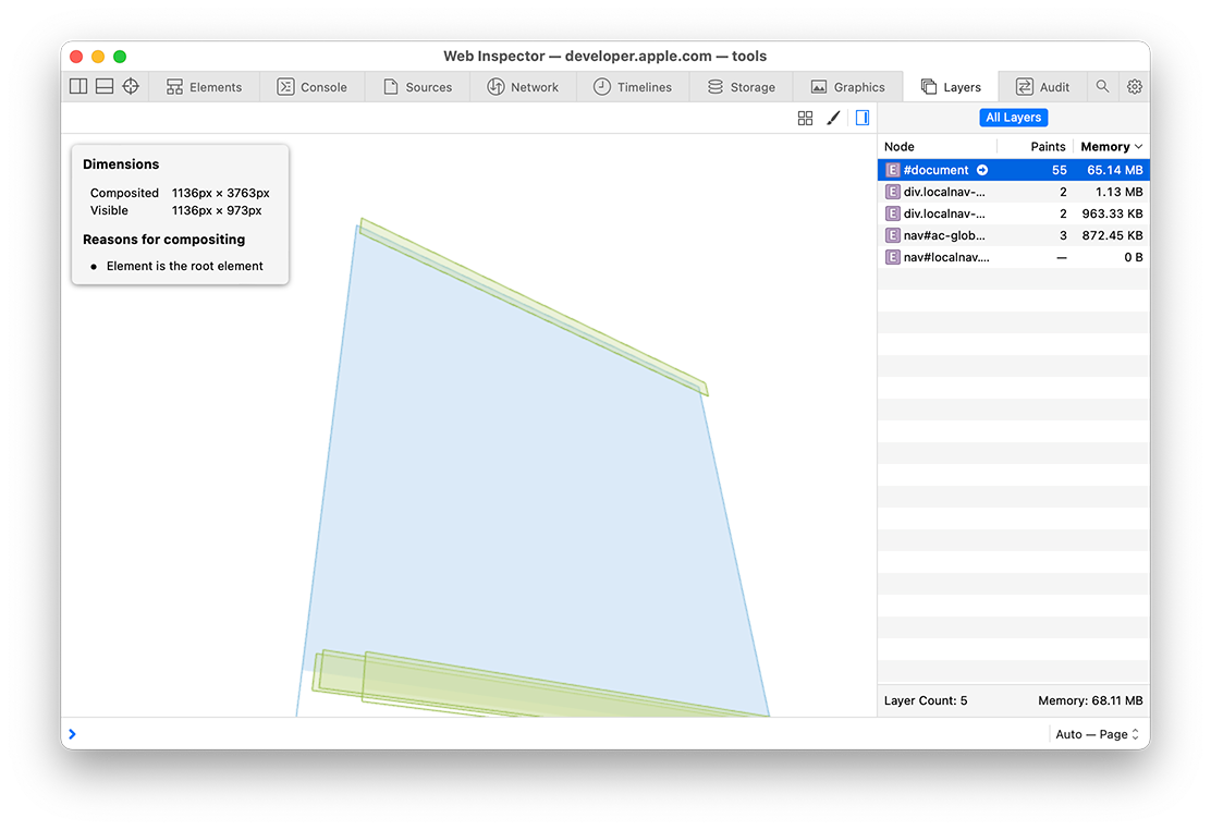 Layers. Visualize compositing layers in 3D to understand where layers are generated and in what order they'll render. Use layers to help find unexpected memory consumption or excessive repaints on a web page.